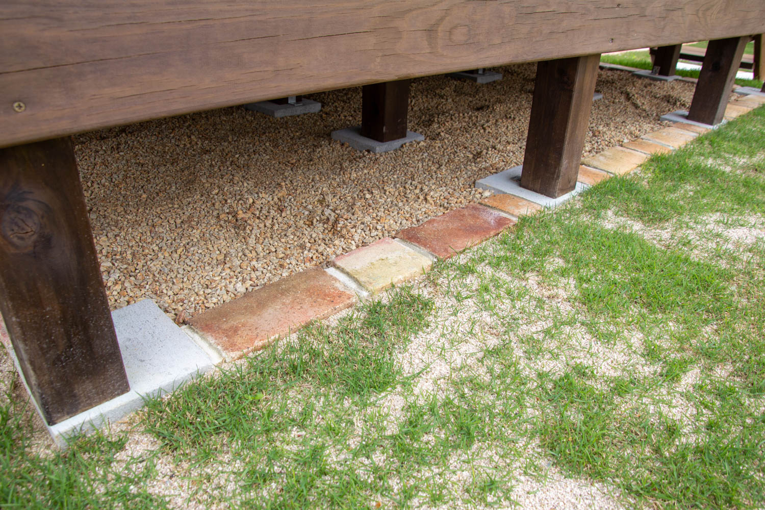 デッキ下は、手入れがしにくい場所になるため、芝生と区切り、防草対策を施しています