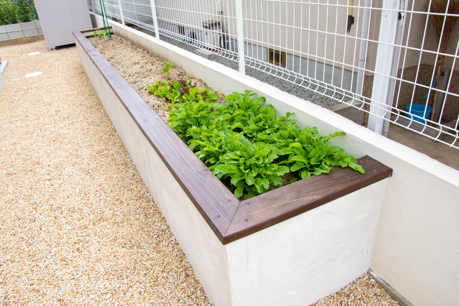 主庭とは別に腰高の菜園を作らせて頂きました。縁にウッドで仕上げ、手が当たる部分を柔らかくしています。また、腰高のため、作業もしやすいと思います
