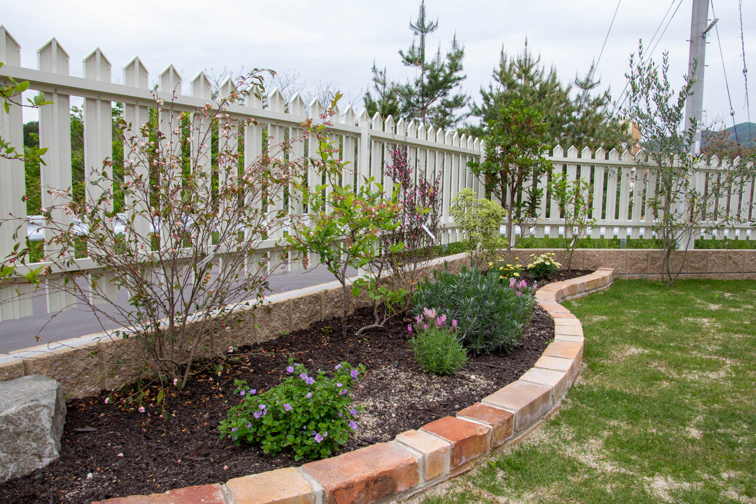 アンティークレンガで緩やかな曲線の花壇はお客様のご提案です