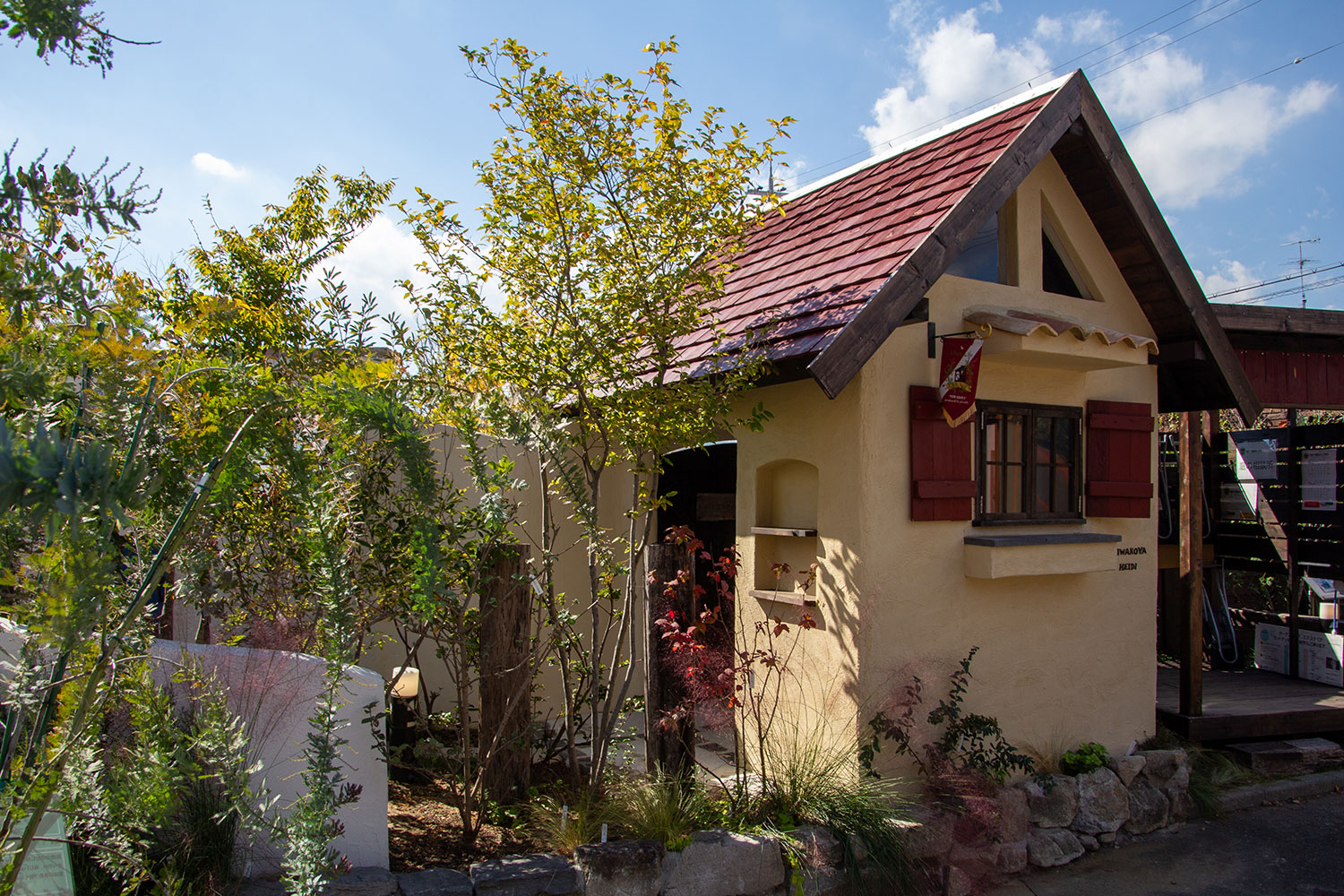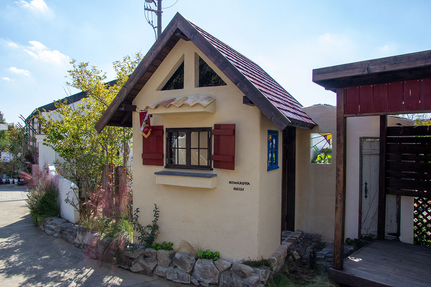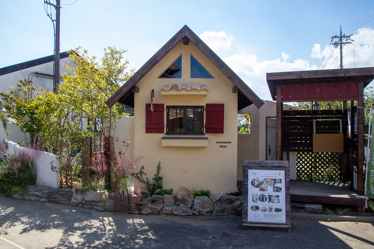 庭小屋ハイジ。屋根の傾斜を45°程度の急勾配にして山小屋風に仕上げました。そのためハイジと命名しました。