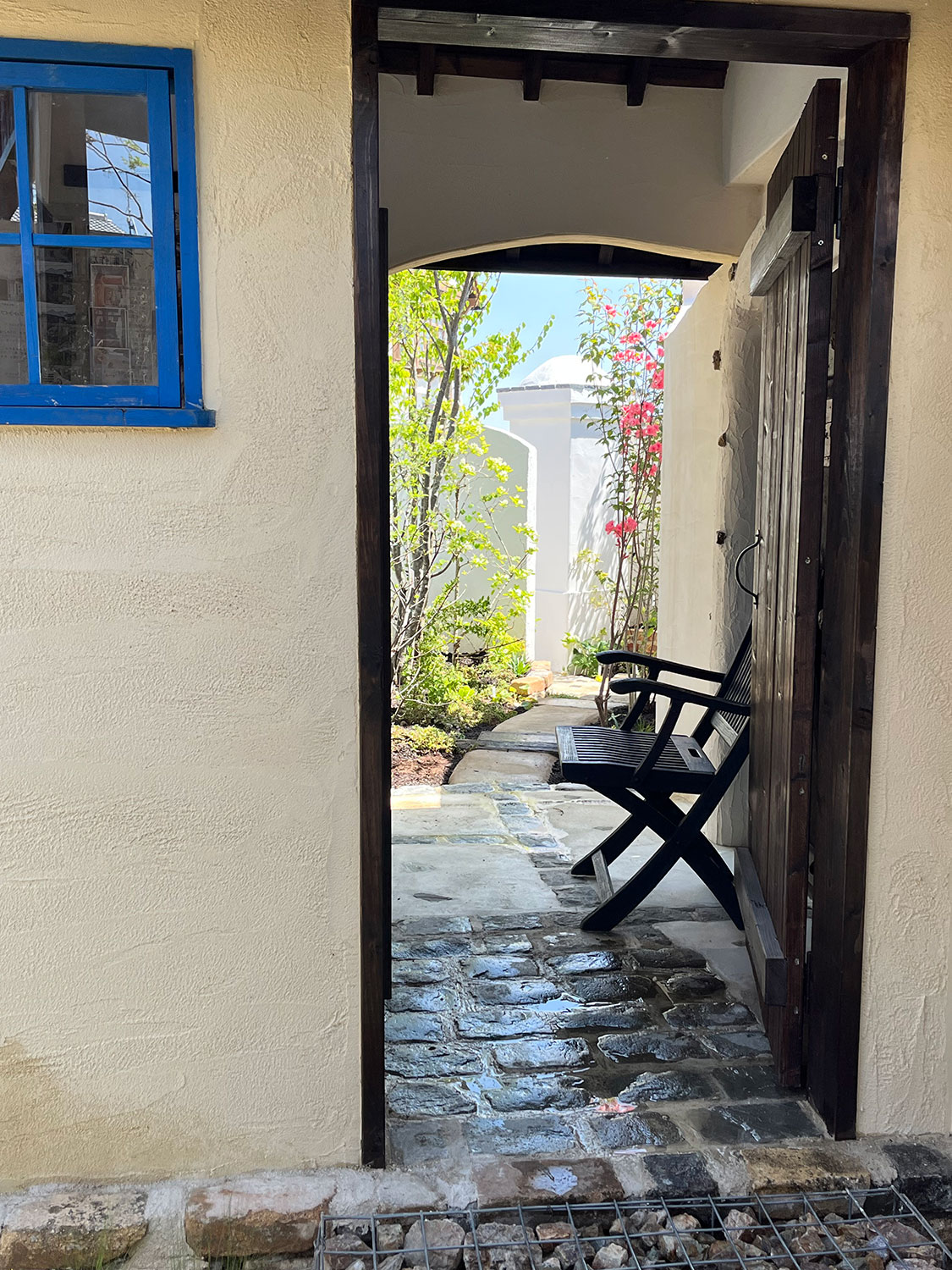 青いドアのある背景の壁は、以前展示しておりました庭小屋シャルロッテを再利用しております。