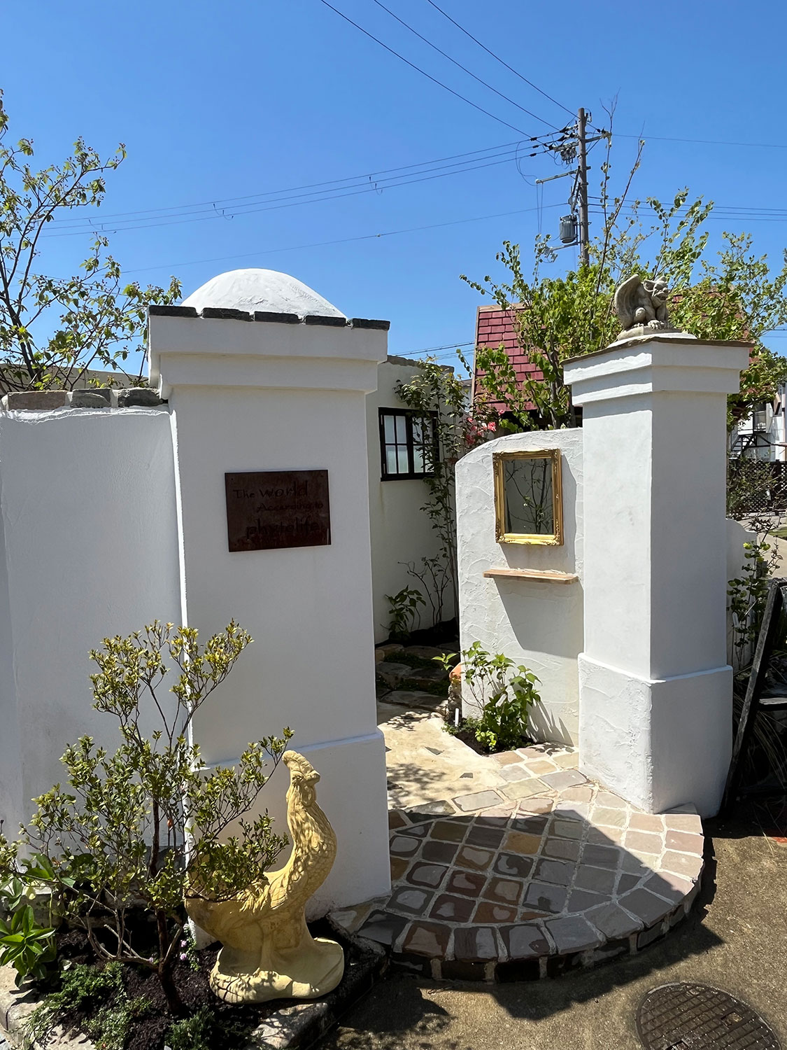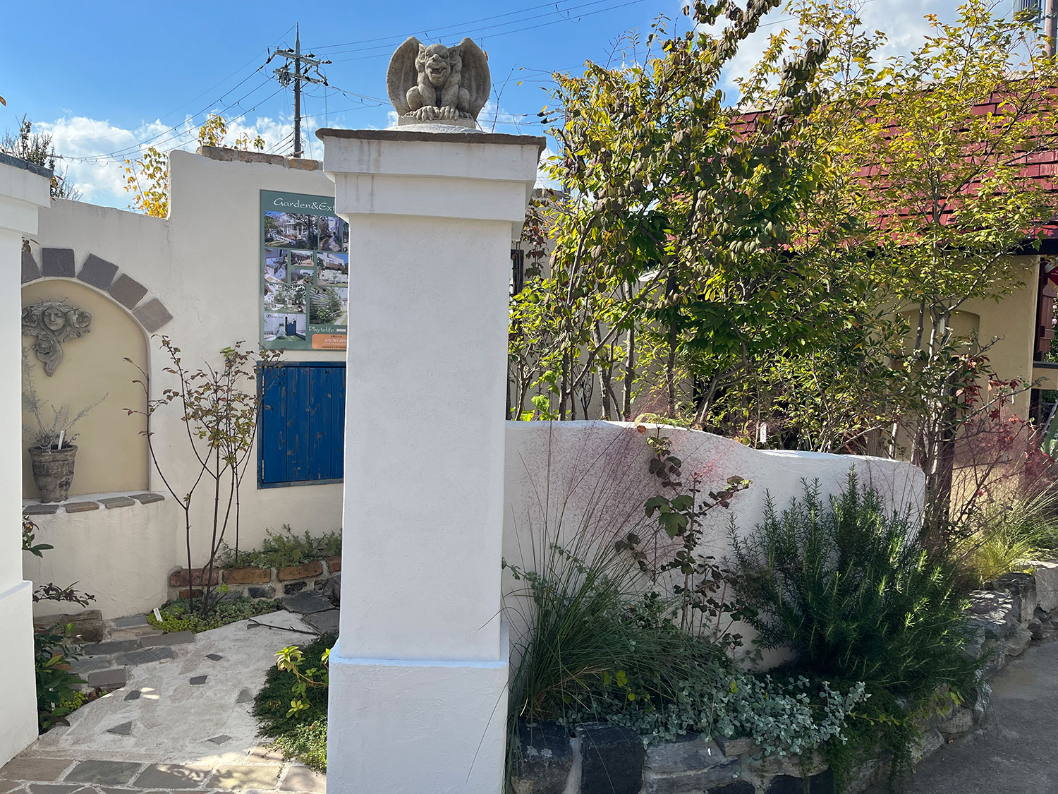 門頭から見下ろすガーゴイル。今回の設計では、通常制作後こうした塑像などを置きますが、塑像を主体に設計しております。こうしたアイテムはお客様もステンドガラスや様々な雑貨をお持ちだと思いますが、そのオブジェ自体を主体として設計を行うことになります。