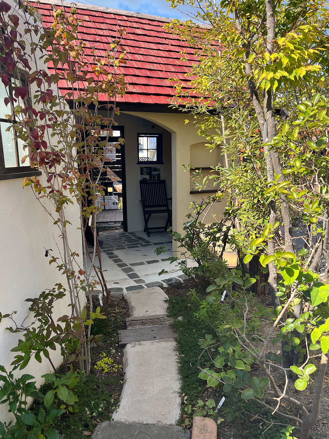 庭小屋ハイジに向かう通路。大きなレンガや枕木。様々な素材を利用しています。