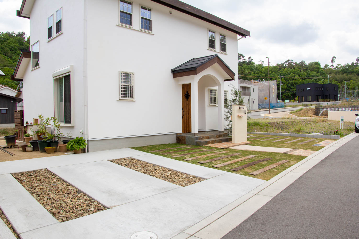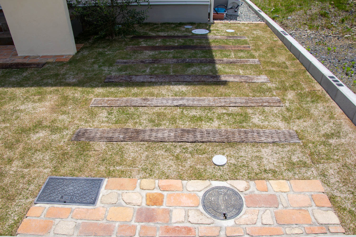 左側の駐車場はモルタル土間2台分。アプローチを挟んで、シンプルに枕木の来客用駐車場。芝生などが生育するには最低でも一日6時間程度の直射日光が必要です。来客用駐車場であれば、シンプルに芝生で作ることがコスト面でもビジュアル面でもお得かもしれません。アプローチは、アンティークレンガと土風の土間です。この部分も自動車が踏む可能性がありますので、強度のある材料が必要です。