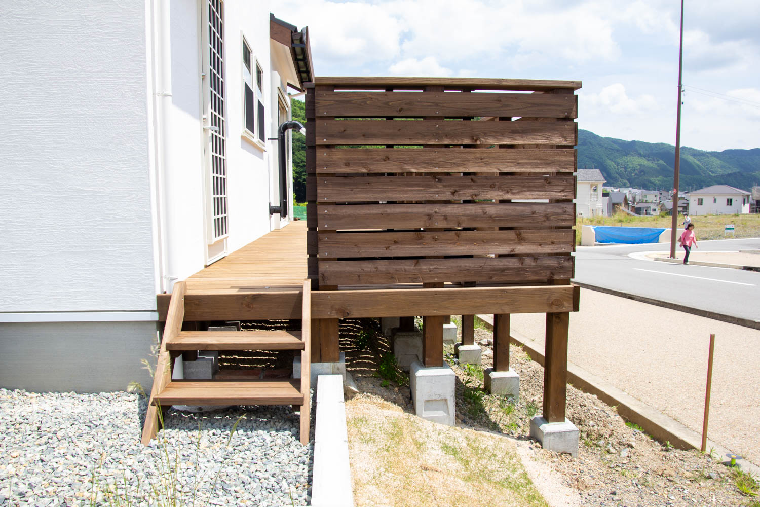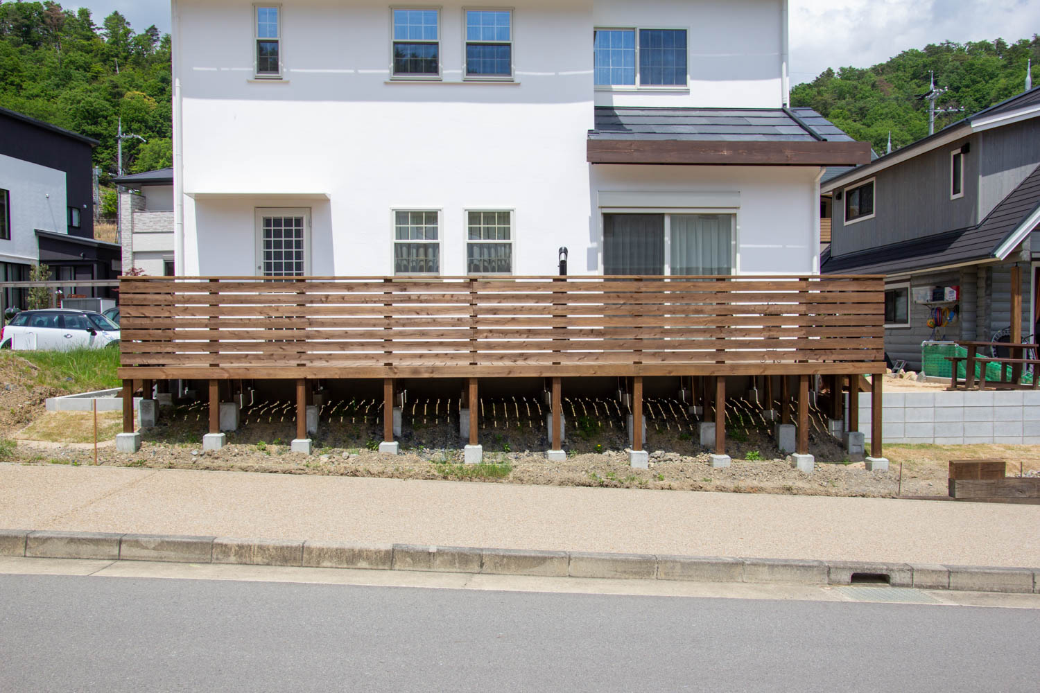 郊外の広い敷地の新築に、駐車場やウッドデッキとウッドフェンスなどを制作しました。
