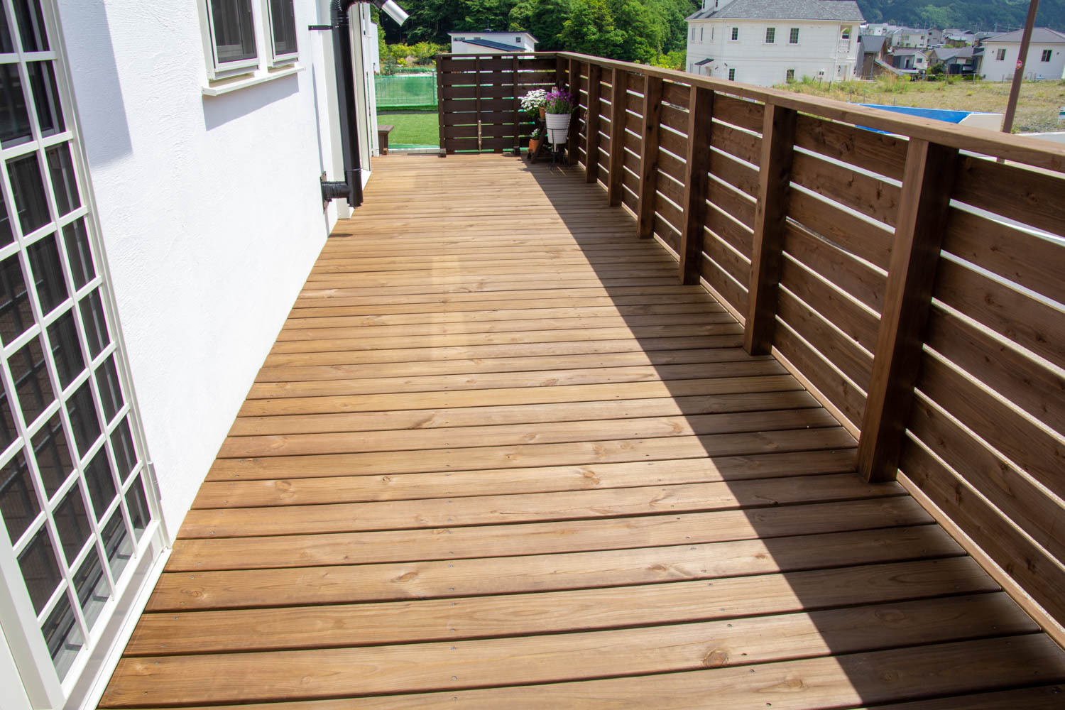 ・リビング面に遮蔽用ウッドフェンスとデッキ