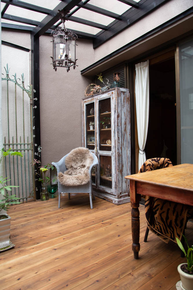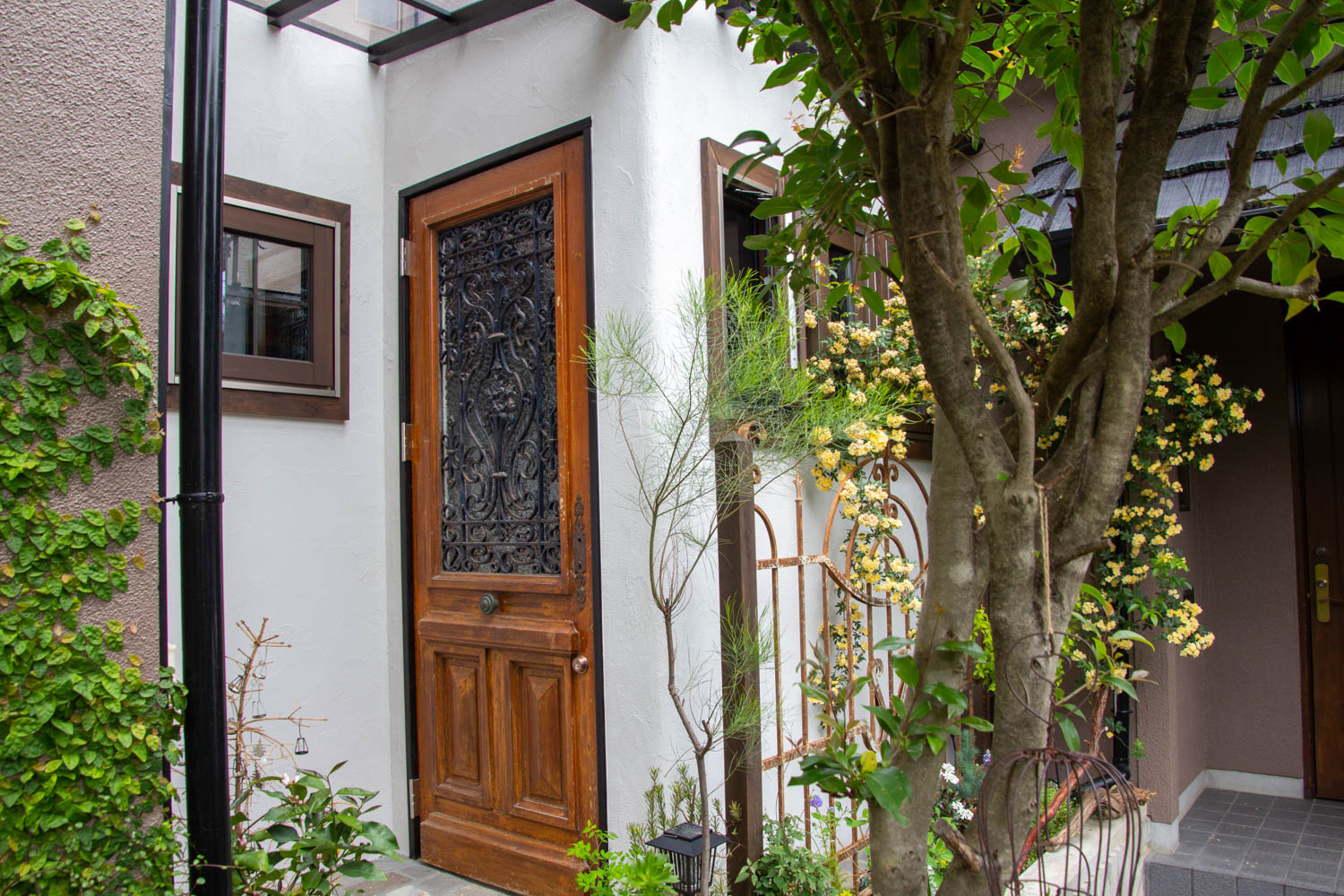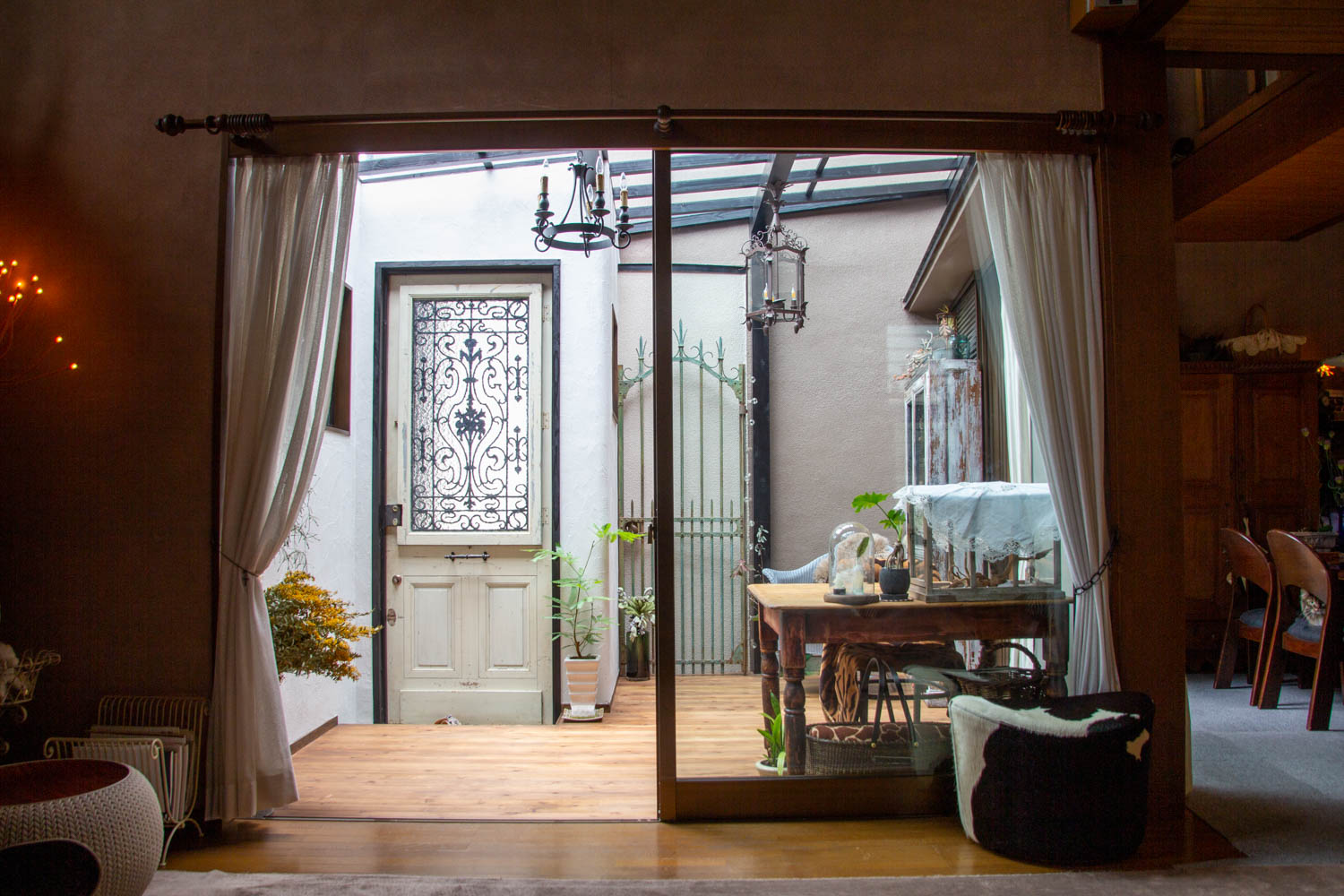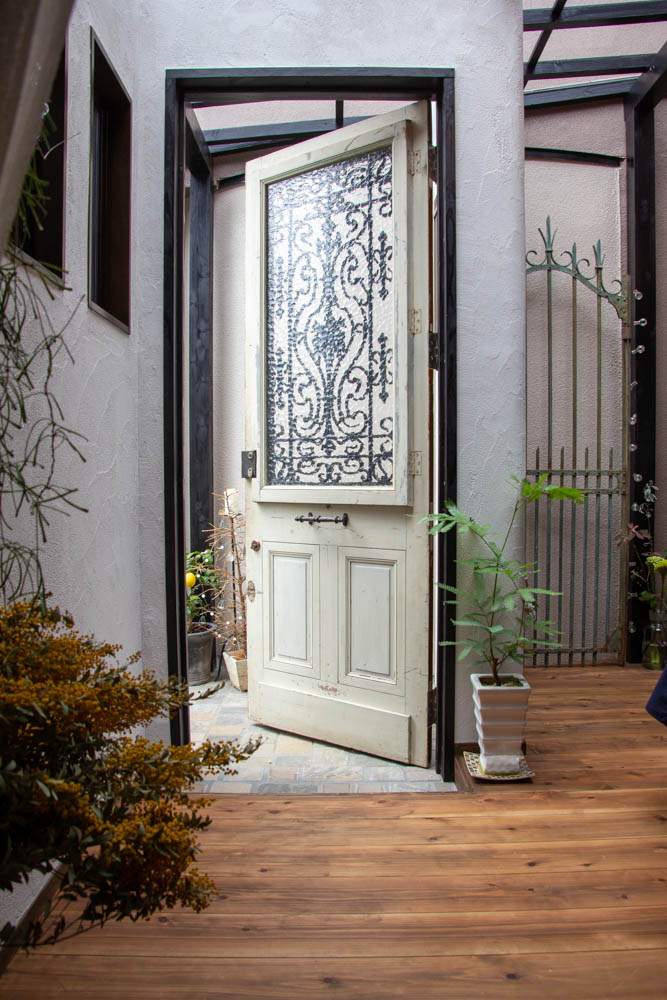 サンルーム入り口付近。サッシの窓を3つはめ込み。ウッドで囲み柔らかい雰囲気にしています。お客様が購入されたアンティークドアを取り付けました。壁はイタリア漆喰で仕上げています